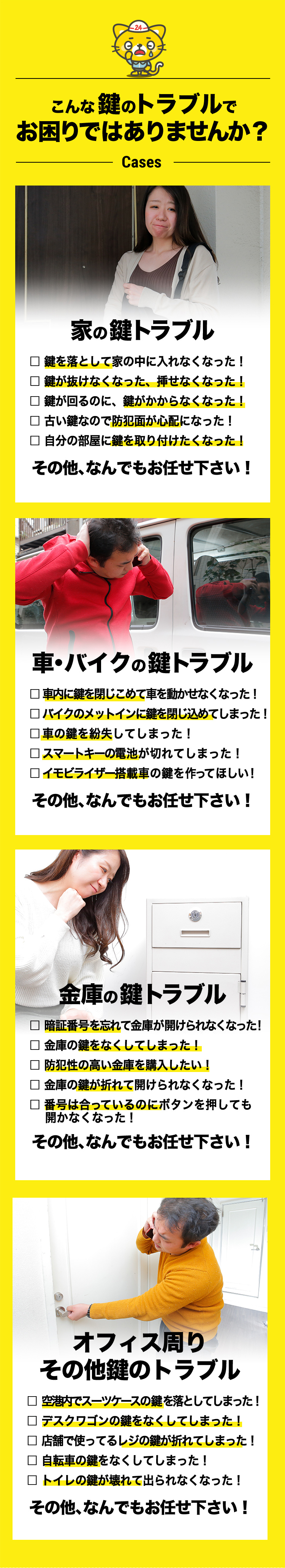 福岡の「カギの出張24時間」は、博多や天神地区で迅速に鍵のサービスを提供。地元住民から観光客まで、すべてのお客様に安心と安全を届けるため、24時間365日体制で対応します。福岡で信頼できる鍵屋が必要な時、当店が解決します。